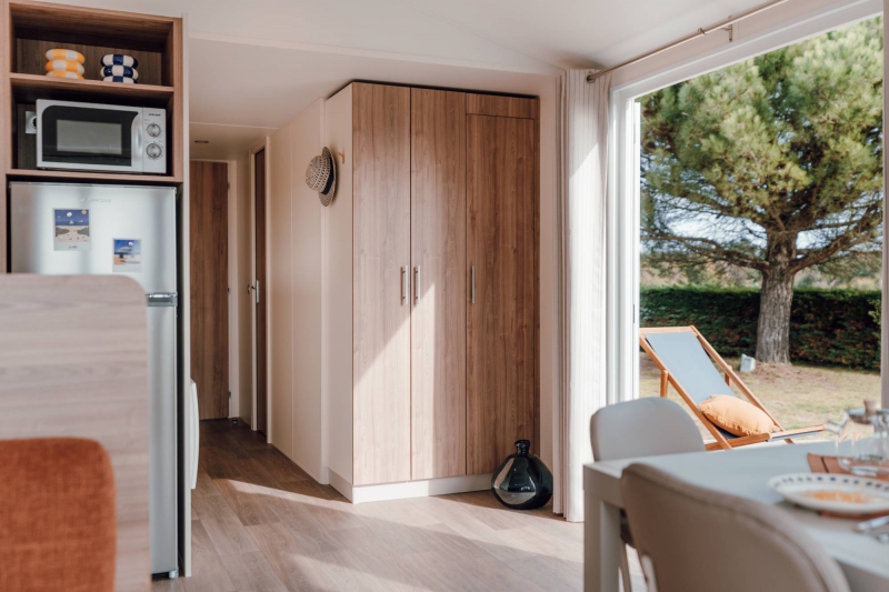 Séjour lumineux • Table ergonomique 80 x 80 cm avec rallonge intégrée 160 x 80 cm. • 4 chaises avec assise moelleuse en polyvinyle. • Grand meuble de rangement dans l’entrée. • Chauffe-eau Hydropower dans un meuble à l’entrée + clips à balai. Dégagement • Convecteur intelligent 500 W. • Grand miroir horizontal. Chambre enfants / invités • 2 lits 80 x 190 cm matelas mousse anallergique haute résilience 35 kg/m3, labellisé OEKO-TEX. • Large tête de lit de protection. • 1 chevet amovible. • Meuble pont en tête de lit à porte coulissante. • Meuble de rangement avec étagère et penderie. • Combistore occultant moustiquaire. de série Cuisine ultra équipée • Plaque gaz 4 feux coloris inox avec crédence de protection en verre blanc. • Hotte aspirante inox. • Réfrigérateur-congélateur 2 portes coloris Silver, intégré dans meuble de rangement. • Pré-équipement lave-vaisselle. • Évier inox avec mitigeur design. • Nombreux rangements et grand casserolier 3 tiroirs. • Store enrouleur en toile sur fenêtre. Salle d’eau grand confort • NOUVEAU : bac de douche 100 x 80 cm au toucher soyeux avec seuil extraplat. • Barre de douche ajustable en hauteur. • Meuble vasque sur pieds avec porte-serviettes. • Meuble de rangement haut avec miroir sur la porte. • Fenêtre avec vitrage de courtoisie dépoli pour une intimité optimale. • WC indépendants.